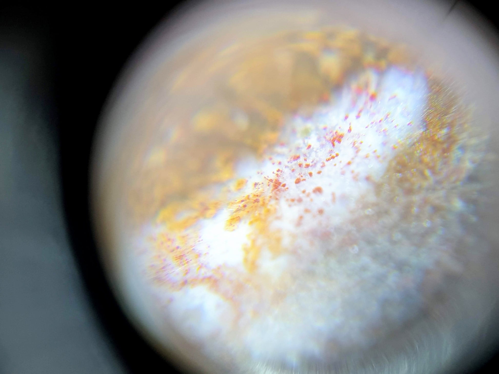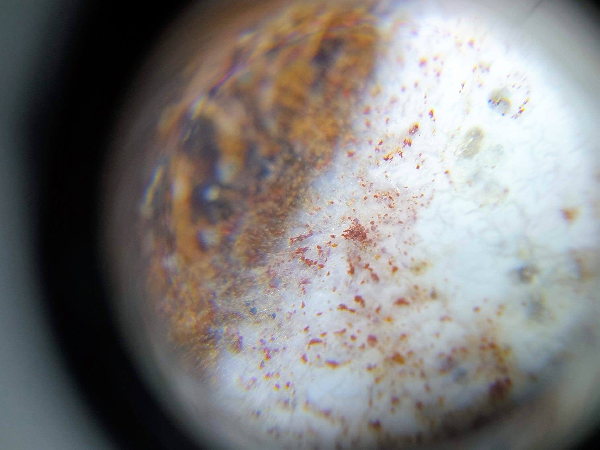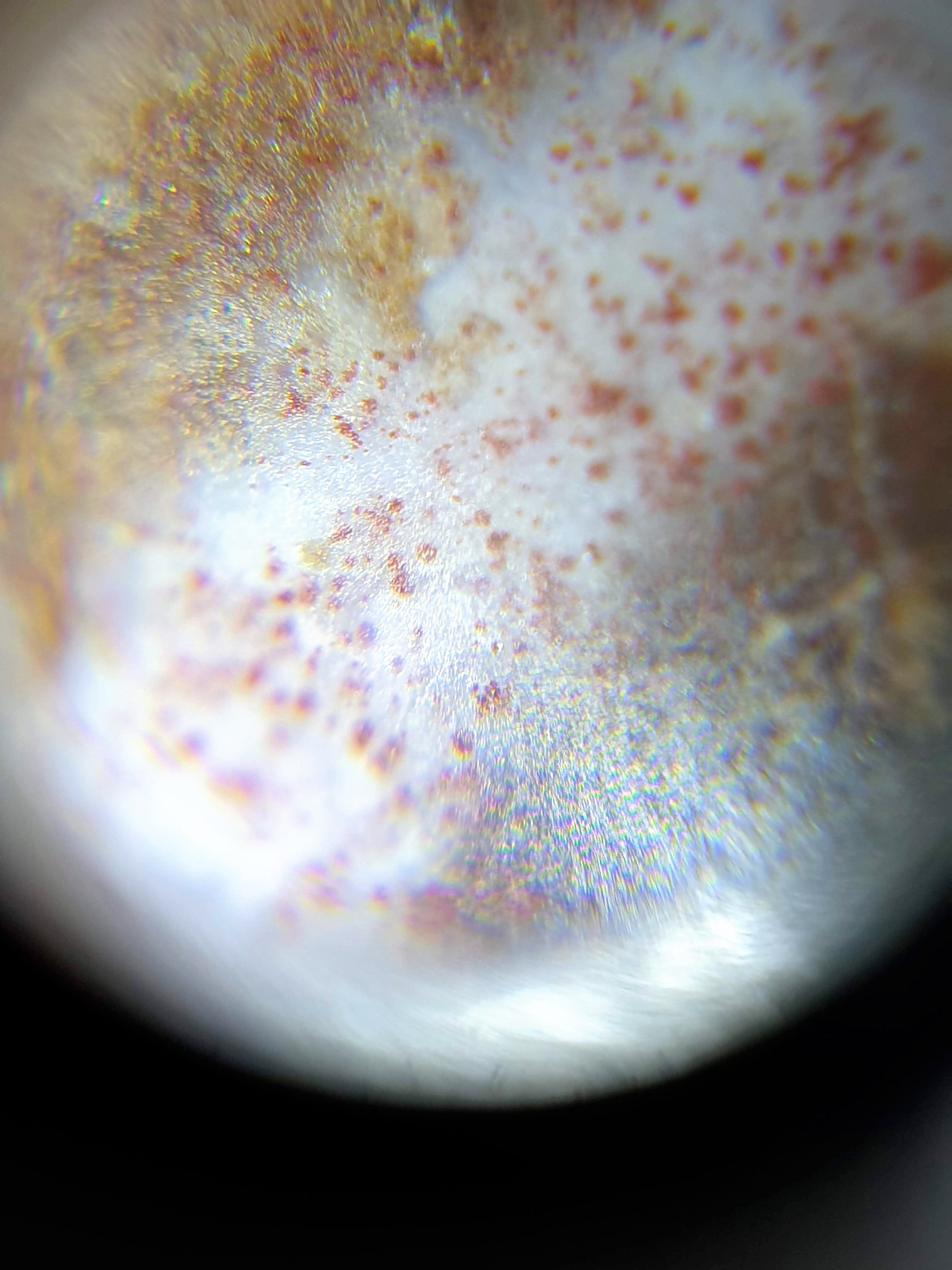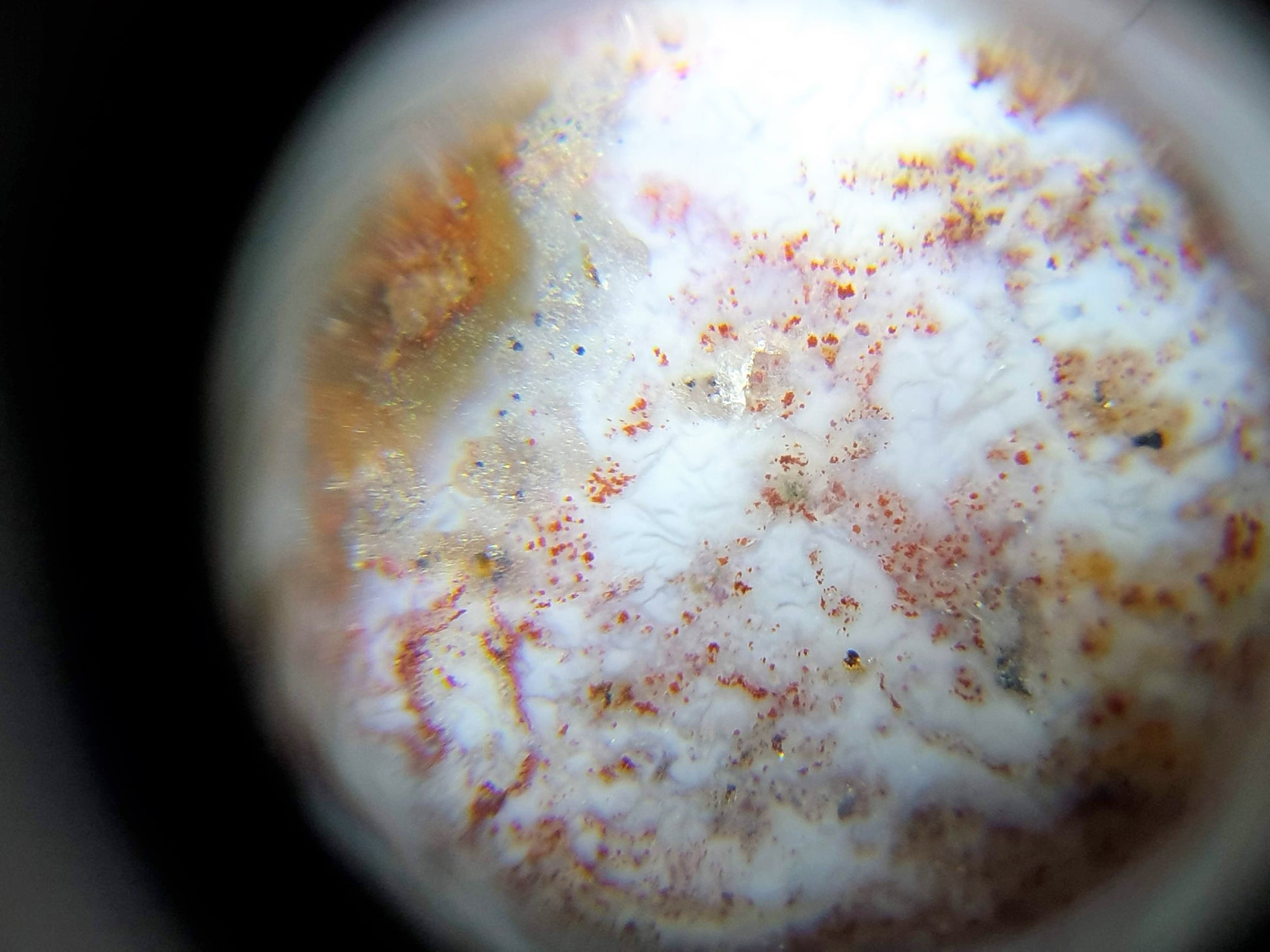 Cinnabar dots are also known as "bloodspots" or "硃砂" in Chinese. They occur when mercury and sulfur are present when the agate was formed. Mercuric sulfide (or cinnabar) is obtained when mercury reacts with sulfur. In its purest form, the color is a deep red. In fact, it is how vermilion pigment is made. However, it is difficult and rare to find it in its purest form in agate. The purest form, used to make vermillion, is usually obtained in labs where conditions can be controlled. In nature, there is usually other material present thus giving it slight variations in its redness.