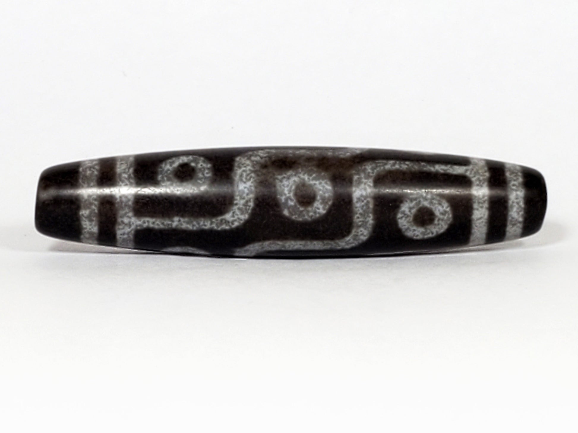 This bead measures 57.7 mm x 12.9 mm. This is a newly crafted dzi. It is crafted within the last twenty years or so. It is very well crafted.
