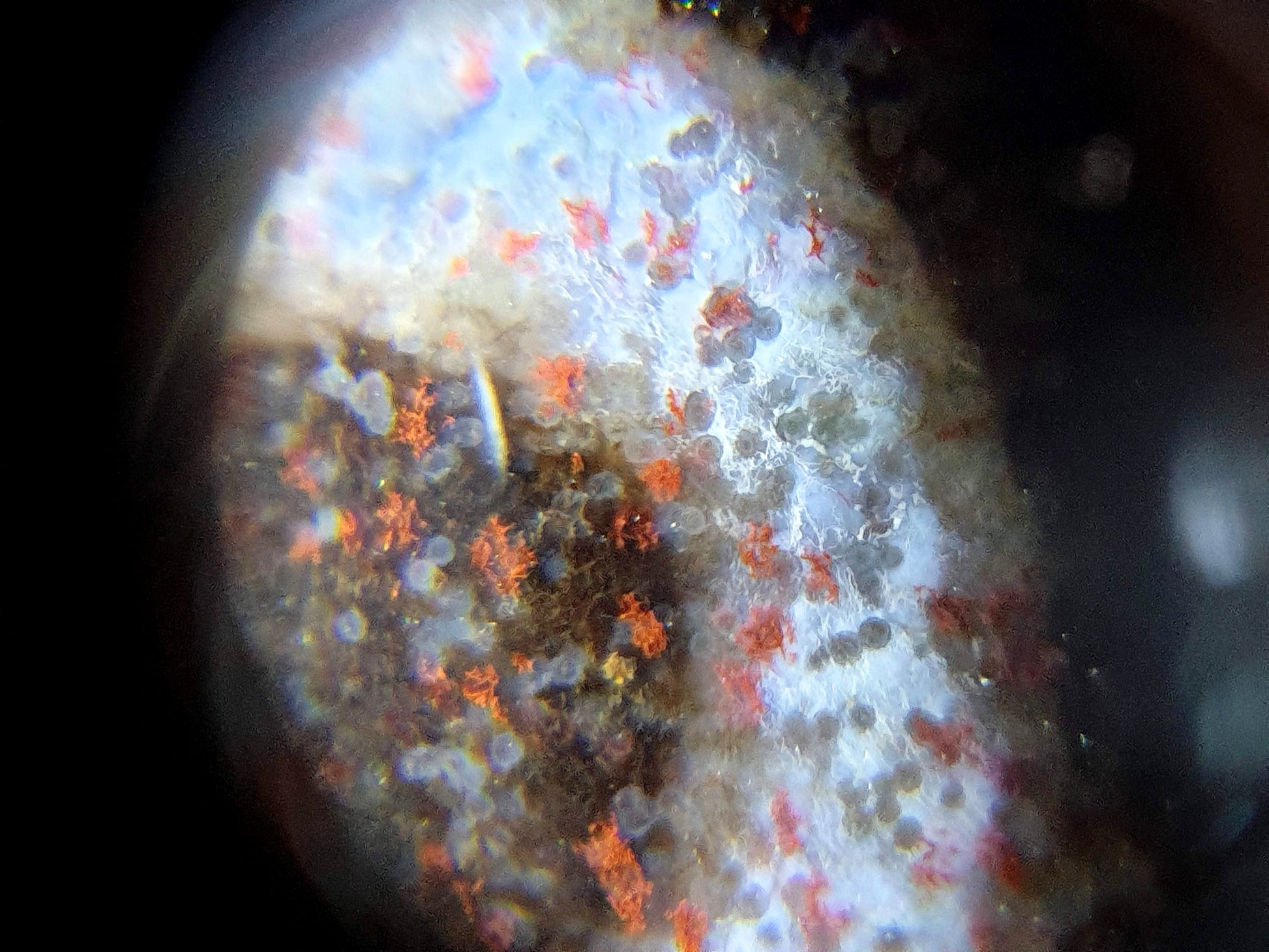 Cinnabar dots are also known as "bloodspots" or "硃砂" in Chinese. They occur when mercury and sulfur are present when the agate was formed. Mercuric sulfide (or cinnabar) is obtained when mercury reacts with sulfur. In its purest form, the color is a deep red. In fact, it is how vermilion pigment is made. However, it is difficult and rare to find it in its purest form in agate. The purest form, used to make vermillion, is usually obtained in labs where conditions can be controlled. In nature, there is usually other material present thus giving it slight variations in its redness.