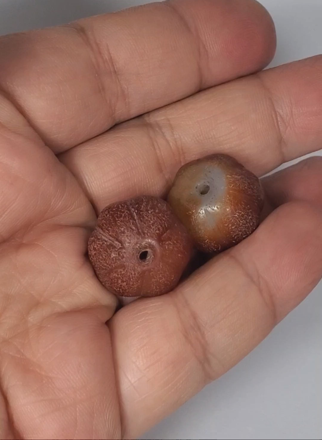 Pair of Ancient Carnelian Pumpkin Dzi Beads - Rare Pumpkin Shape