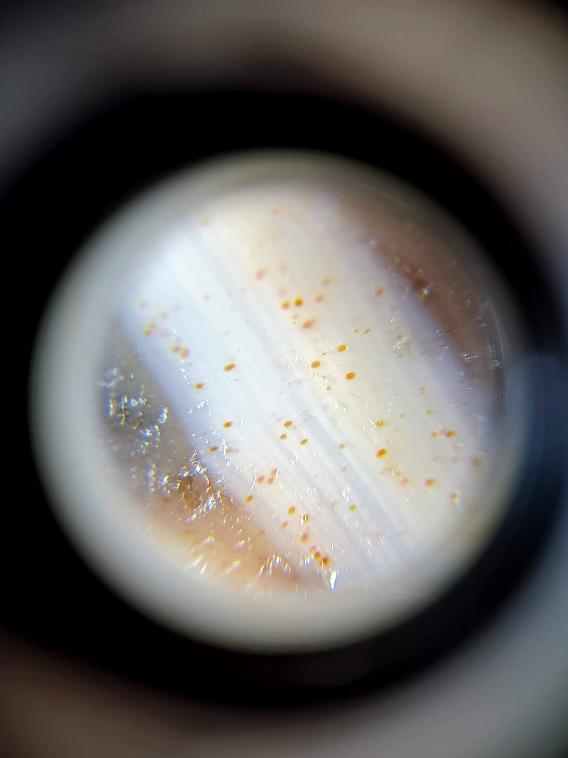 Cinnabar dots are also known as "bloodspots" or "硃砂" in Chinese. They occur when mercury and sulfur are present when the agate was formed. Mercuric sulfide (or cinnabar) is obtained when mercury reacts with sulfur. In its purest form, the color is a deep red. In fact, it is how vermilion pigment is made. However, it is difficult and rare to find it in its purest form in agate. The purest form, used to make vermillion, is usually obtained in labs where conditions can be controlled. In nature, there is usually other material present thus giving it slight variations in its redness.