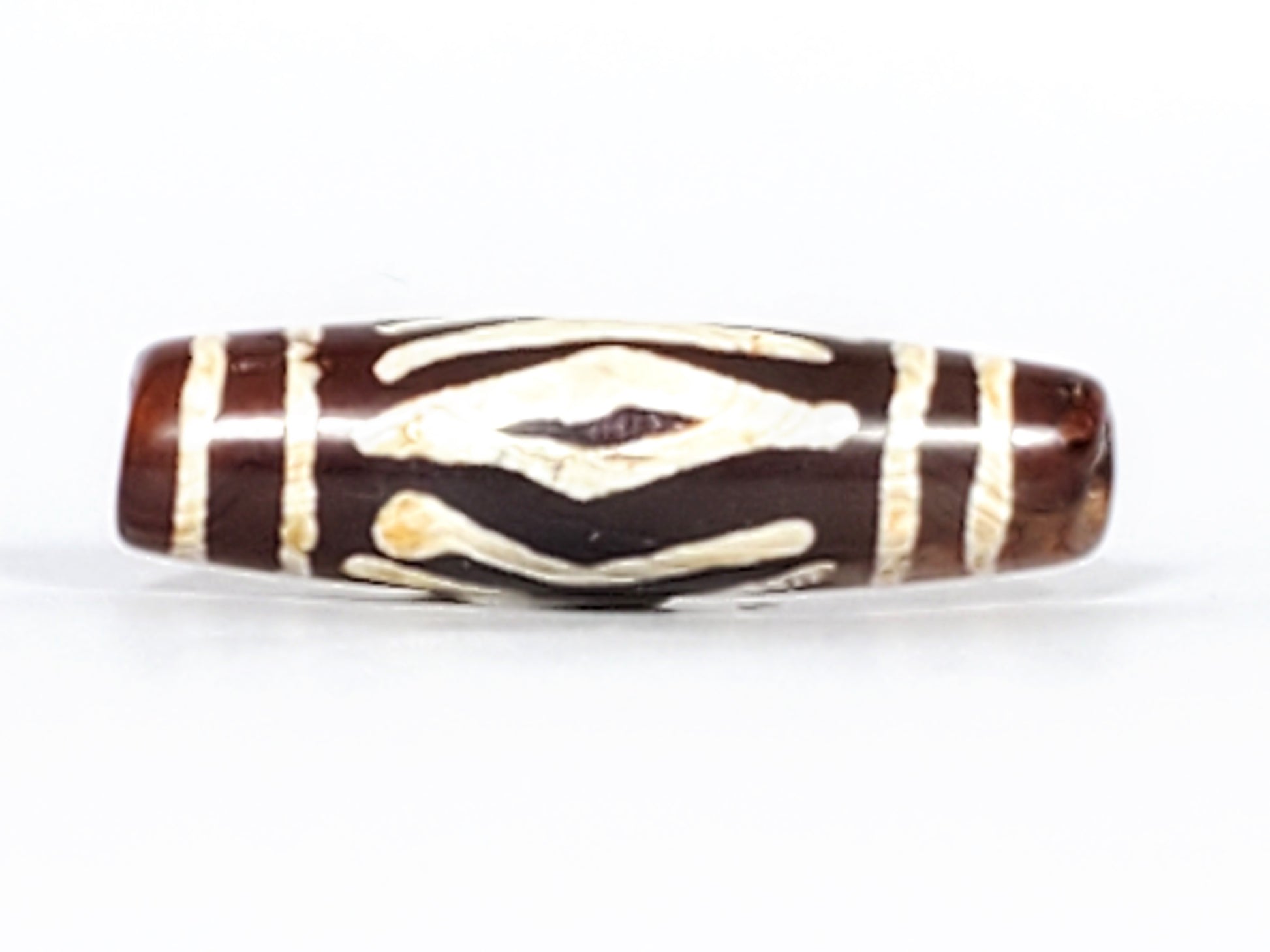 This bead is adorned with the Two Diamond Eye & Tiger Tooth Motif. The Diamond Eye is the precursor to the Eye. The Two Eye Motif is believed to bring good relations both at home and at the workplace. It enables harmony between husband and wife, and it enables harmony amongst co-workers. It is the favorite motif for office managers. The Tiger Tooth Motif is believed to bring strength and courage.