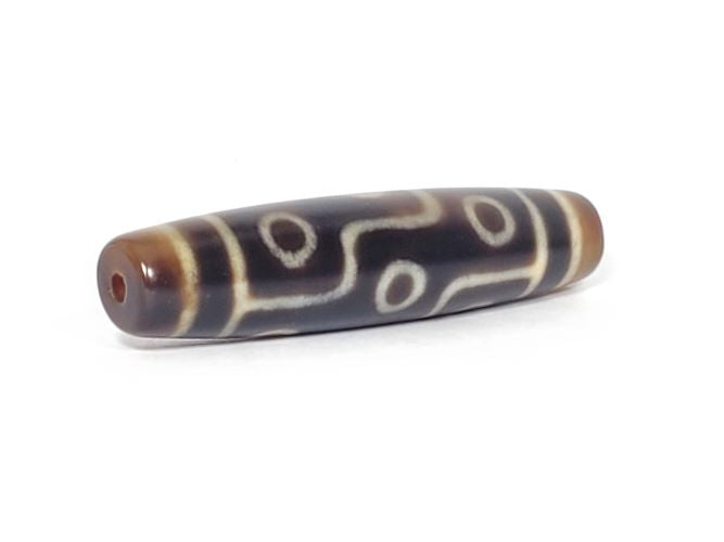 This bead measures 58.2 mm x 13.2 mm. This is a newly crafted Taiwan dzi. It was crafted within the last twenty years or so. It is very well crafted.