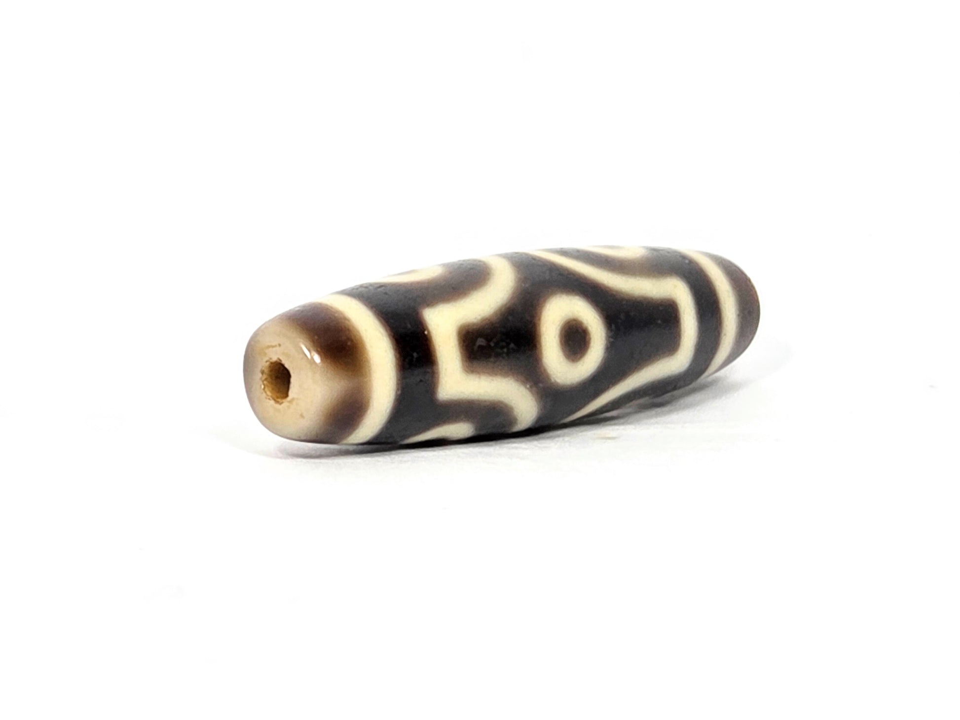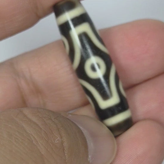 This dzi bead is adorned with the Six Eye Motif. The Six Eye Motif is believed to improve the physiological functions, release from the sufferings (Samsara), and remove impending misfortunes.