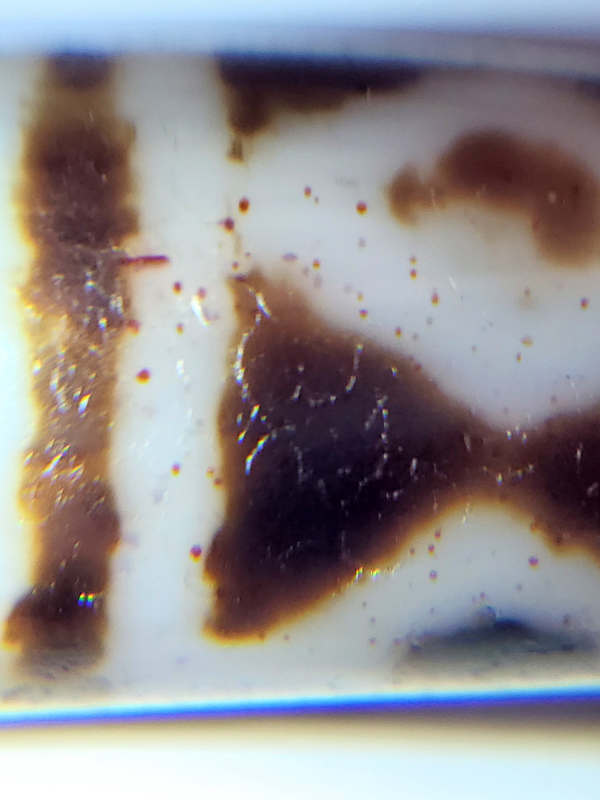 Cinnabar dots are also known as "bloodspots" or "硃砂" in Chinese. They occur when mercury and sulfur are present when the agate was formed. Mercuric sulfide (or cinnabar) is obtained when mercury reacts with sulfur. In its purest form, the color is a deep red. In fact, it is how vermilion pigment is made. However, it is difficult and rare to find it in its purest form in agate. The purest form, used to make vermillion, is usually obtained in labs where conditions can be controlled. In nature, there is usually other material present thus giving it slight variations in its redness.
