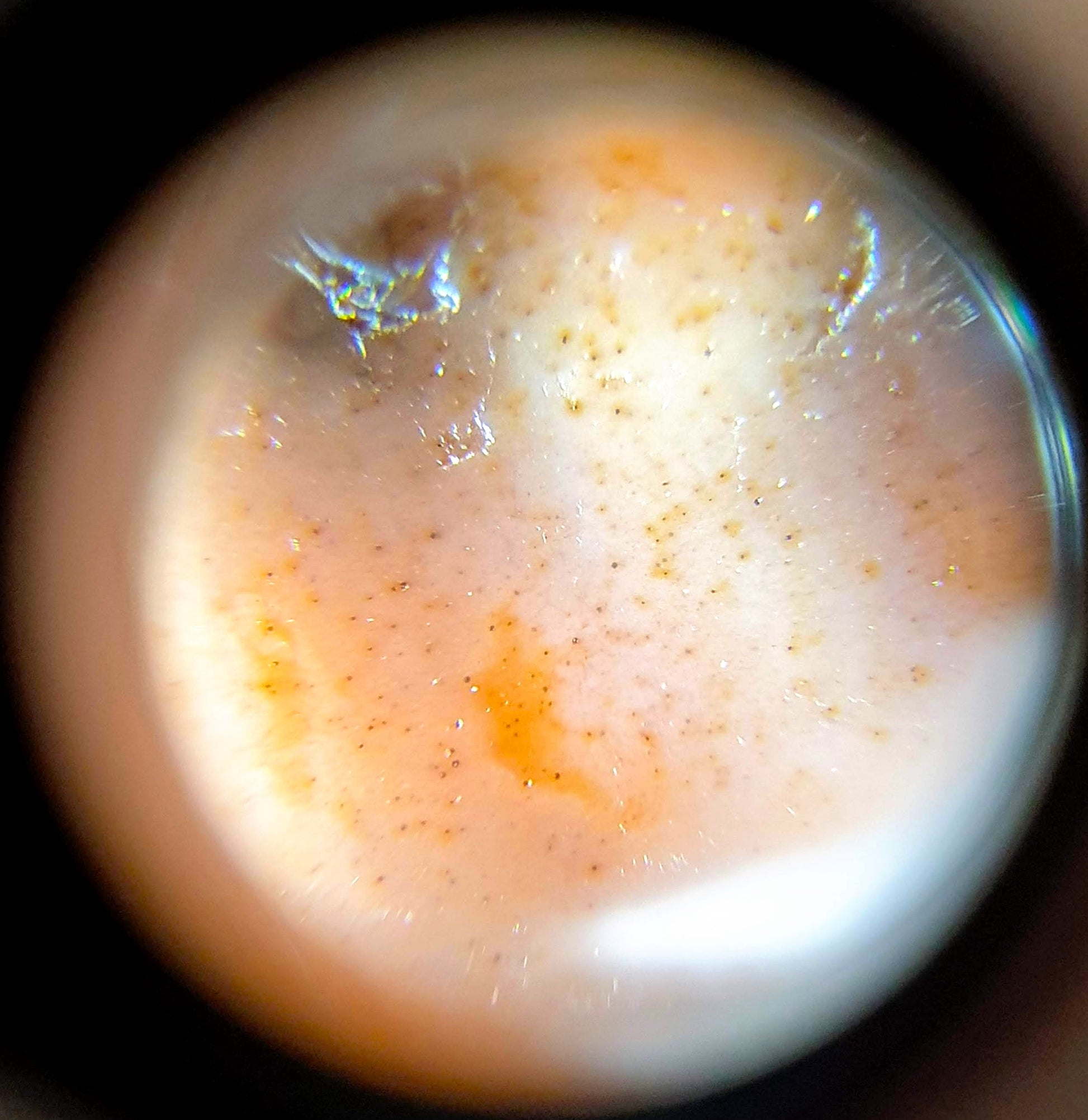 Cinnabar dots are also known as "bloodspots" or "硃砂" in Chinese. They occur when mercury and sulfur are present when the agate was formed. Mercuric sulfide (or cinnabar) is obtained when mercury reacts with sulfur. In its purest form, the color is a deep red. In fact, it is how vermilion pigment is made. However, it is difficult and rare to find it in its purest form in agate. The purest form, used to make vermillion, is usually obtained in labs where conditions can be controlled. In nature, there is usually other material present thus giving it slight variations in its redness.