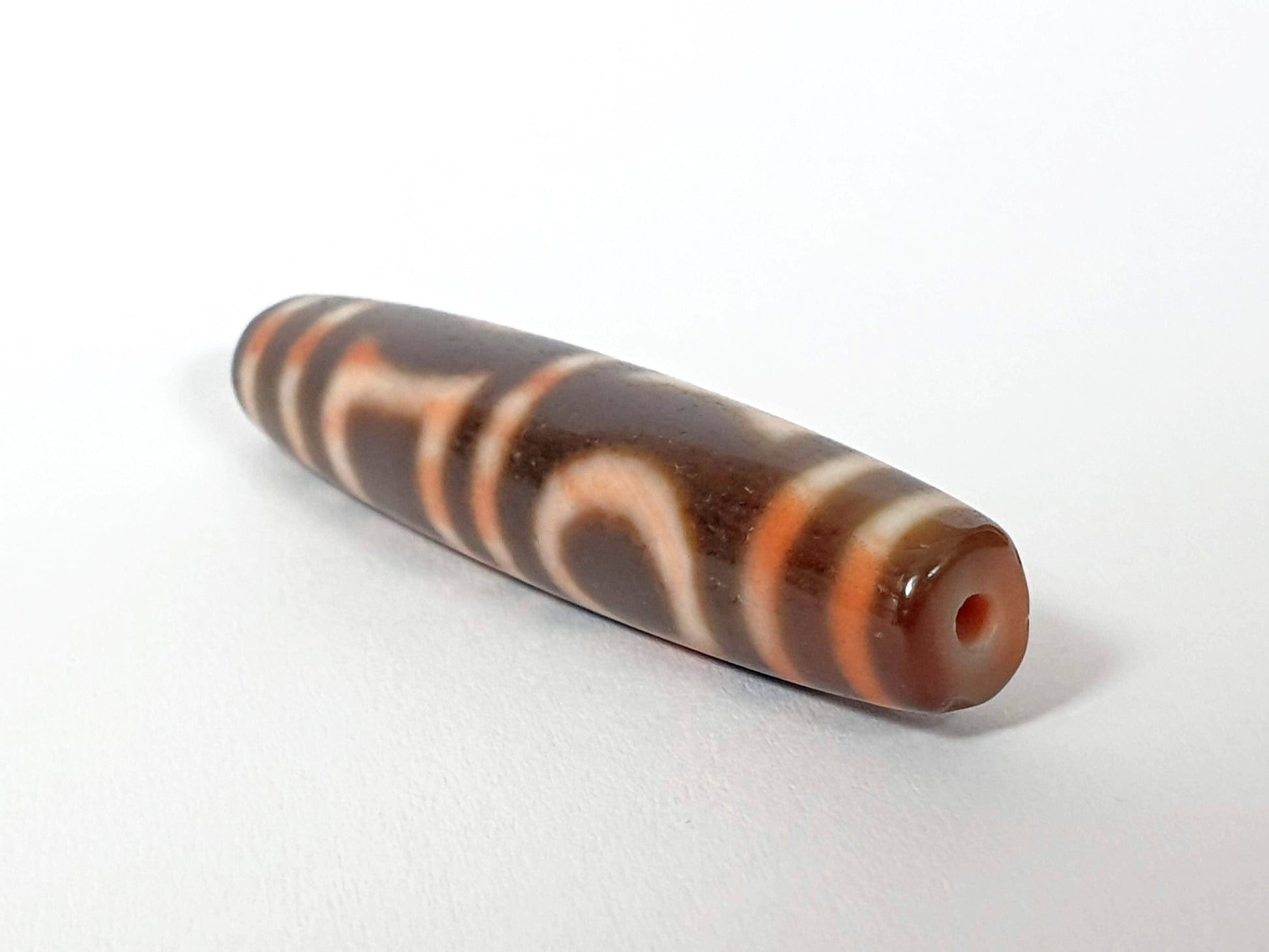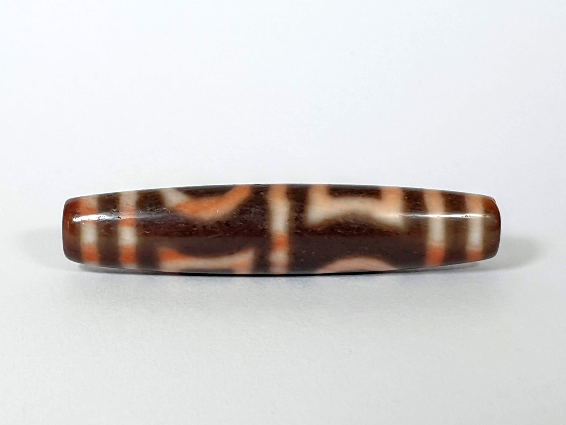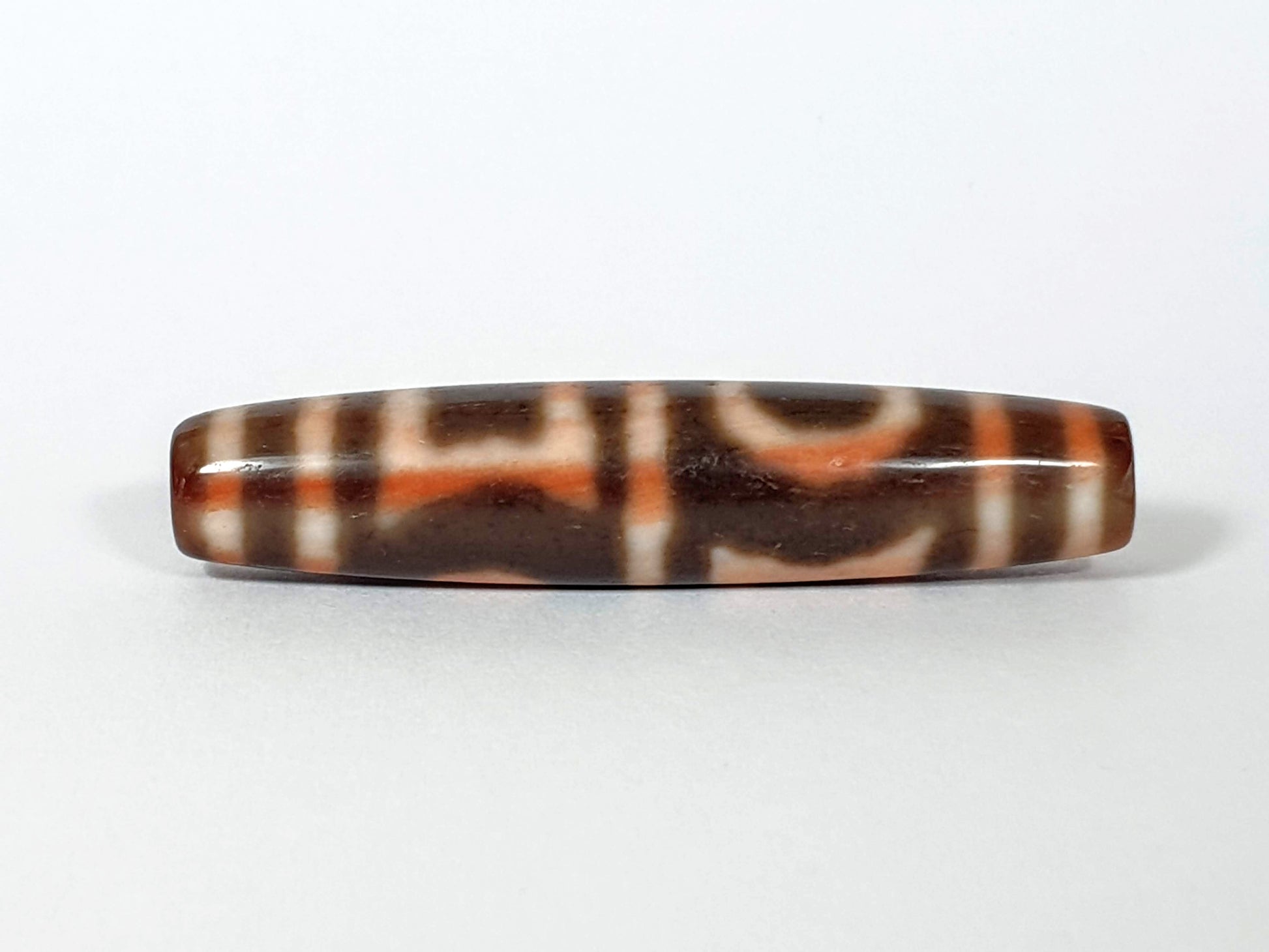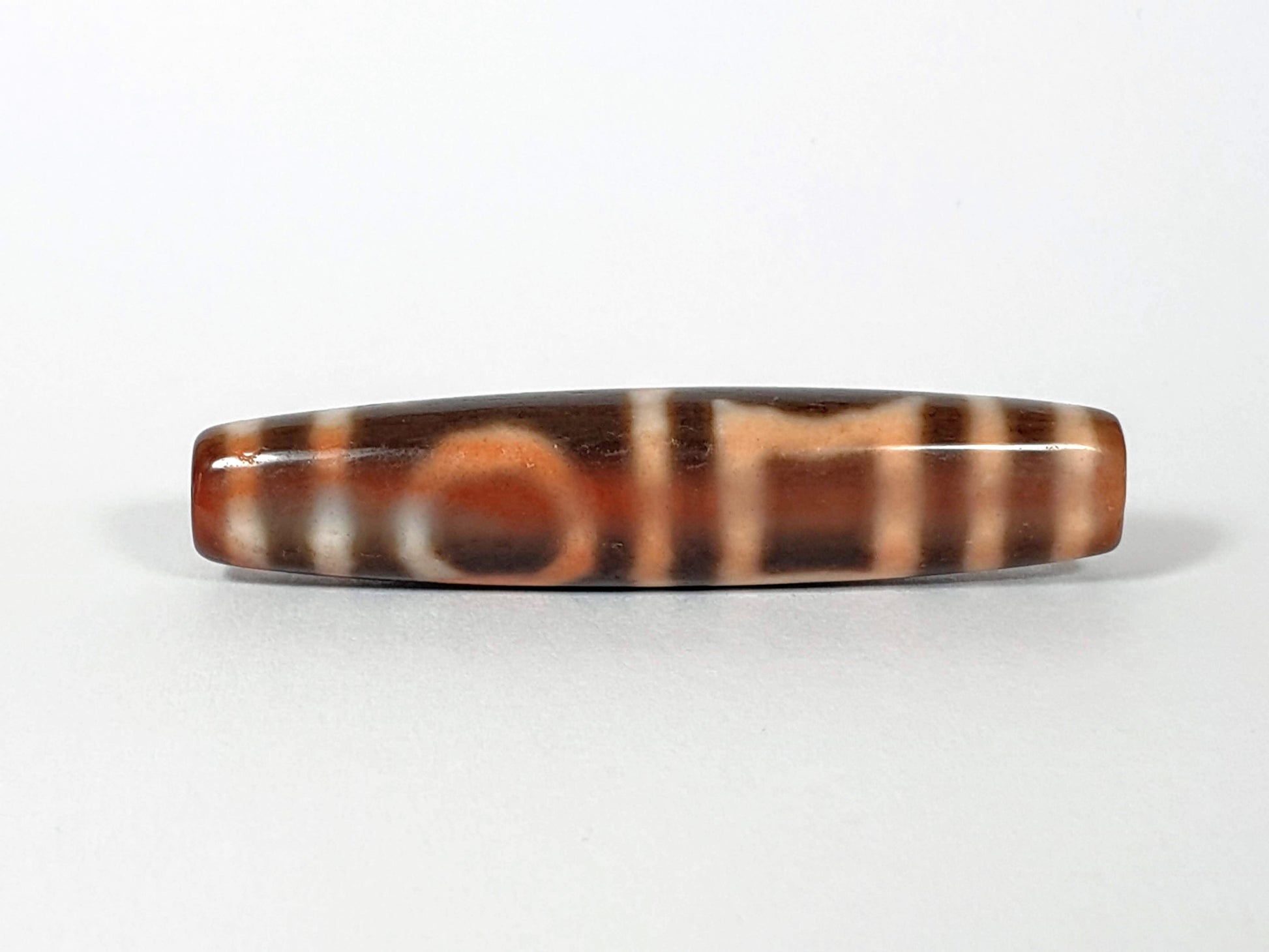 This bead measures 59.4 mm x 13.0 mm. It is a rare Qing Dynasty Chinese Dzi. It is an old bead, estimated to be over 300 years old.