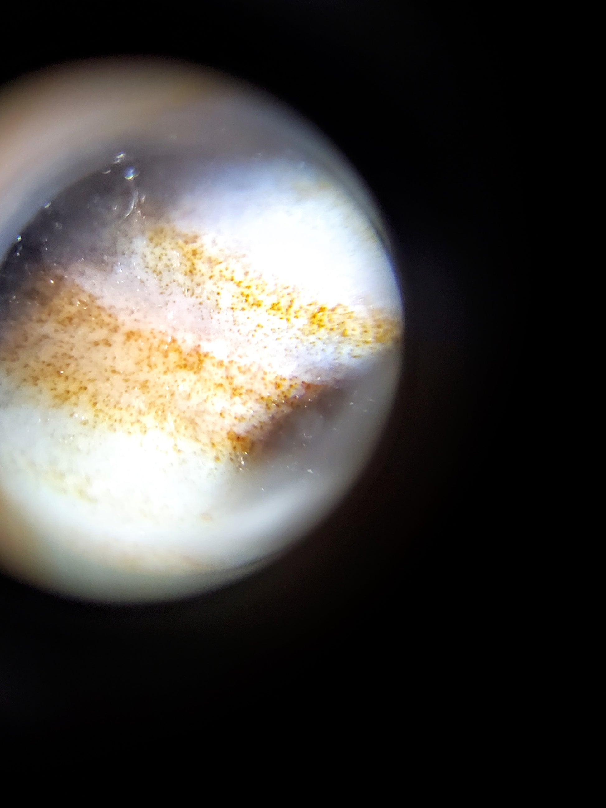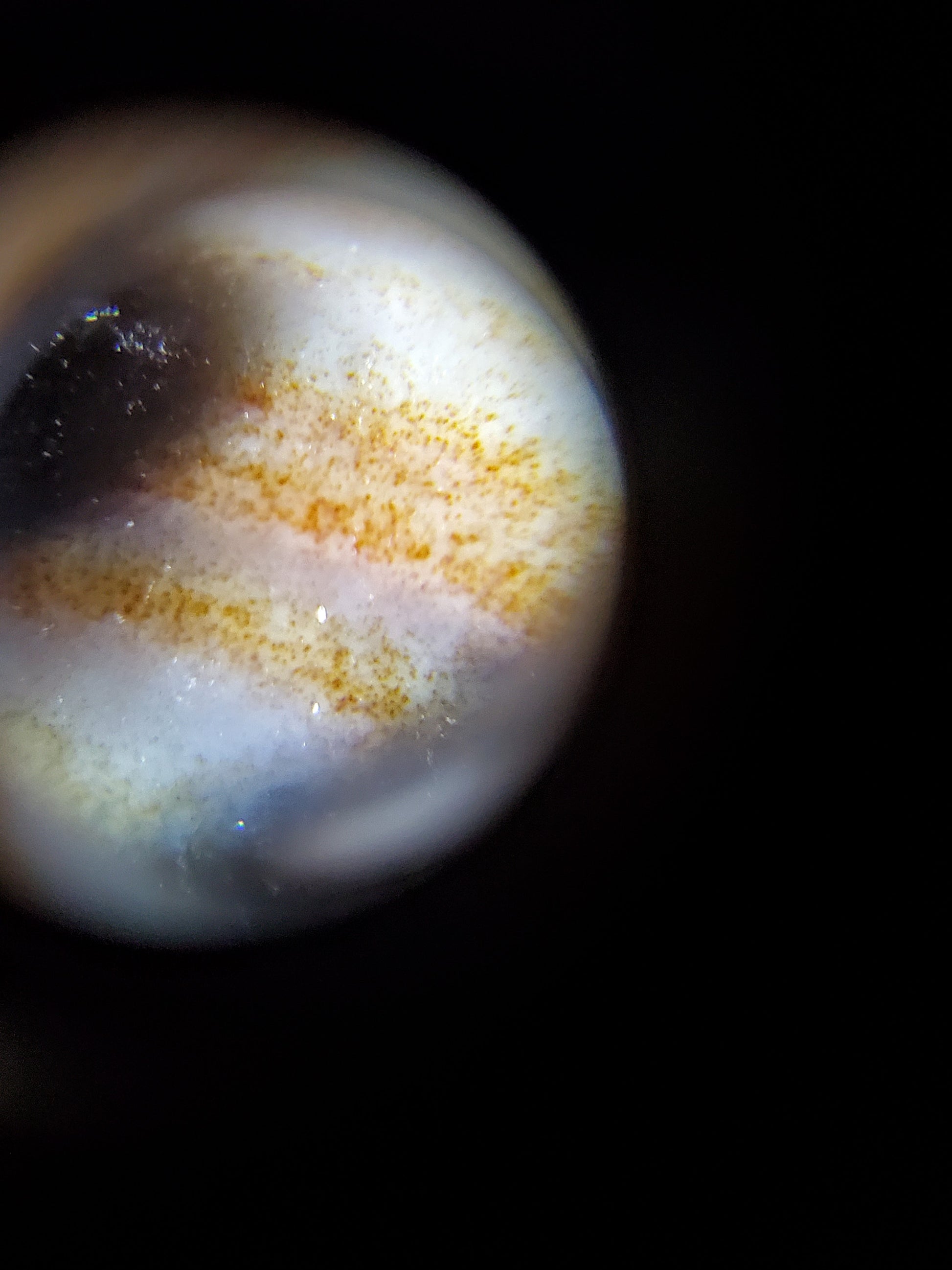 Cinnabar dots are also known as "bloodspots" or "硃砂" in Chinese. They occur when mercury and sulfur are present when the agate was formed. Mercuric sulfide (or cinnabar) is obtained when mercury reacts with sulfur. In its purest form, the color is a deep red. In fact, it is how vermilion pigment is made. However, it is difficult and rare to find it in its purest form in agate. The purest form, used to make vermillion, is usually obtained in labs where conditions can be controlled. In nature, there is usually other material present thus giving it slight variations in its redness.