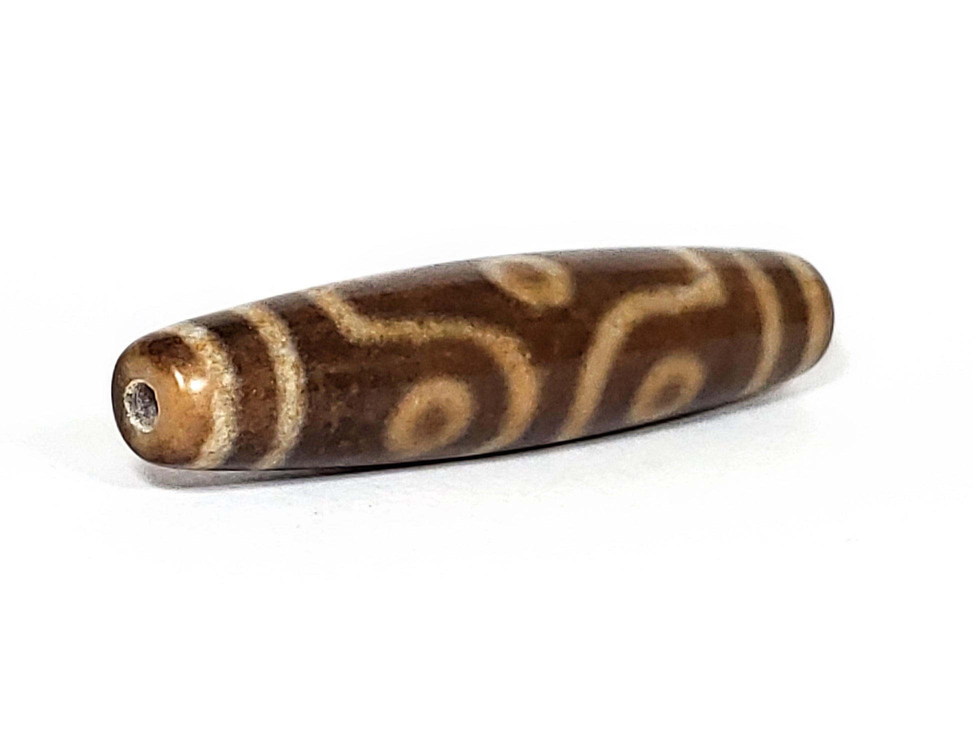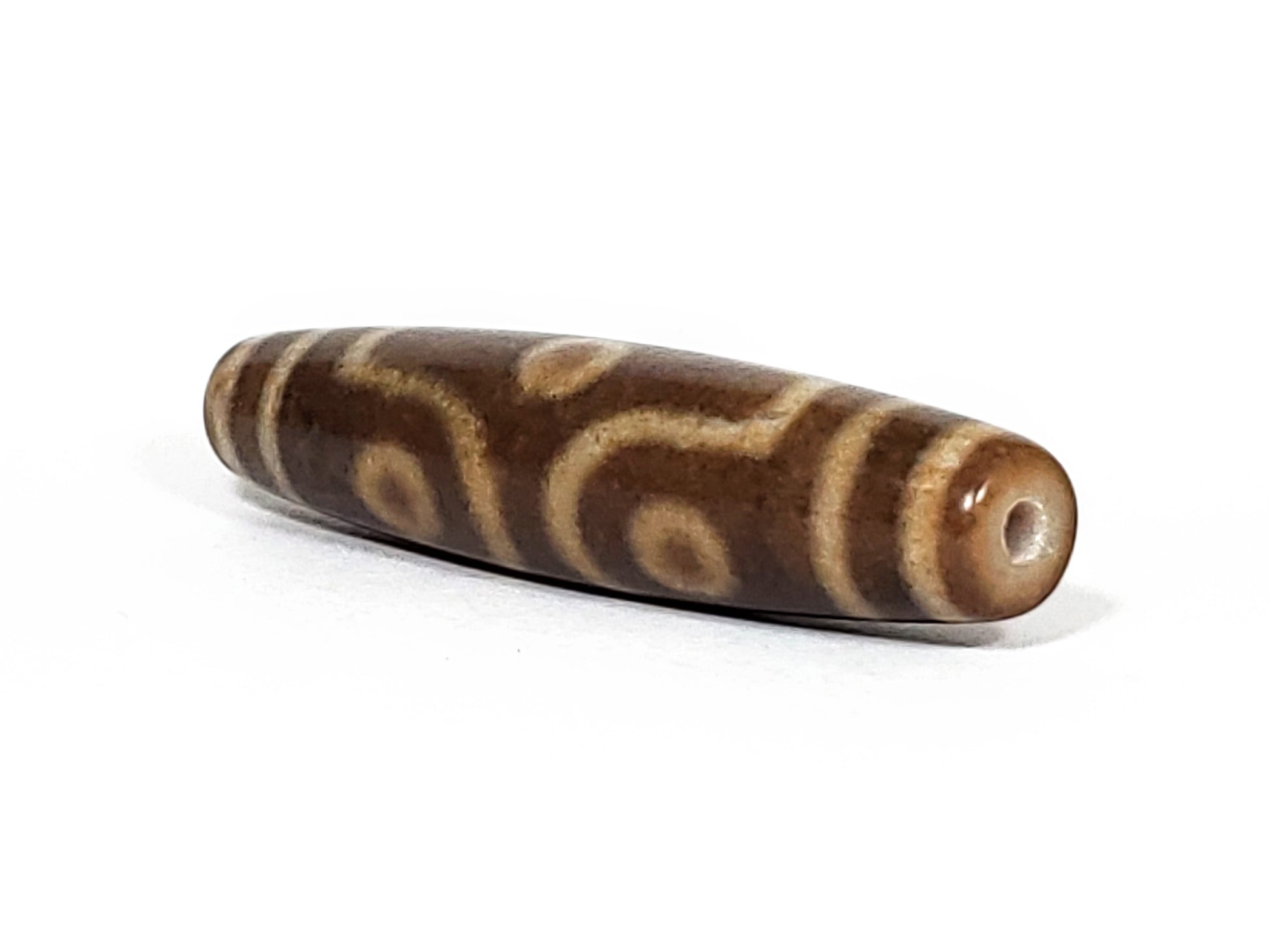 This bead measures 58.2 mm x 13.4 mm. This is a newly crafted dzi. It is crafted within the last twenty years or so. It is very well crafted.