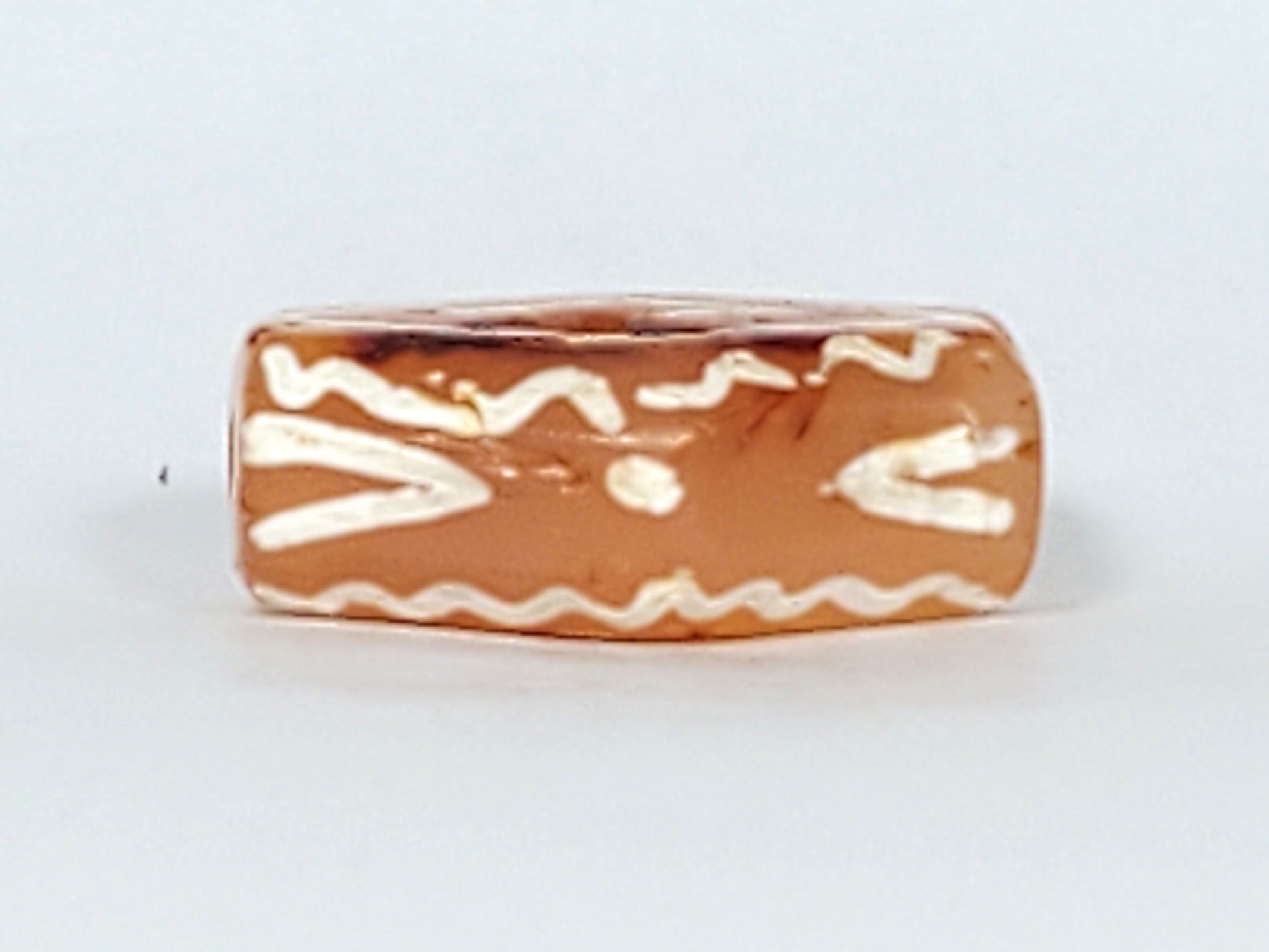 This bead is adorned with the Double Diamond Eye-In-Eye, Wave, Tiger Tooth, & Star Motif. The Diamond Eye is the precursor to the more modern Eye Motif. The Eye-In-Eye Motif is believed to bless its wearer with clear vision and unparalleled wisdom. The Wave Motif is believed to bring never-ending success to its wearer. The Tiger Tooth Motif is believed to bring strength and courage. The Star Motif is believed to bring wisdom and a bright future, further boosting the powers of the Eye-In-Eye.