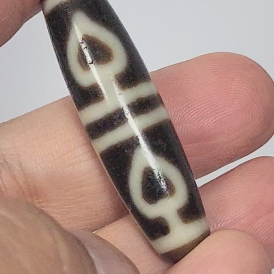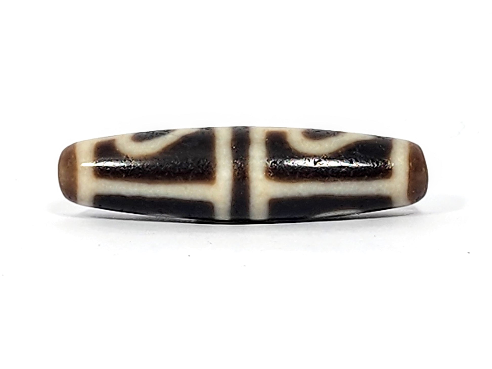 This dzi is adorned with the Four Leaf Bodhi Motif.  The Four Leaf Bodhi Motif (or Four Bodhi Leaf Motif) is believed to help the wearer achieve enlightenment.  The Shakyamuni Buddha was sitting under a bodhi tree when he achieved full enlightenment.  The Bodhi Leaf is symbolic of this.