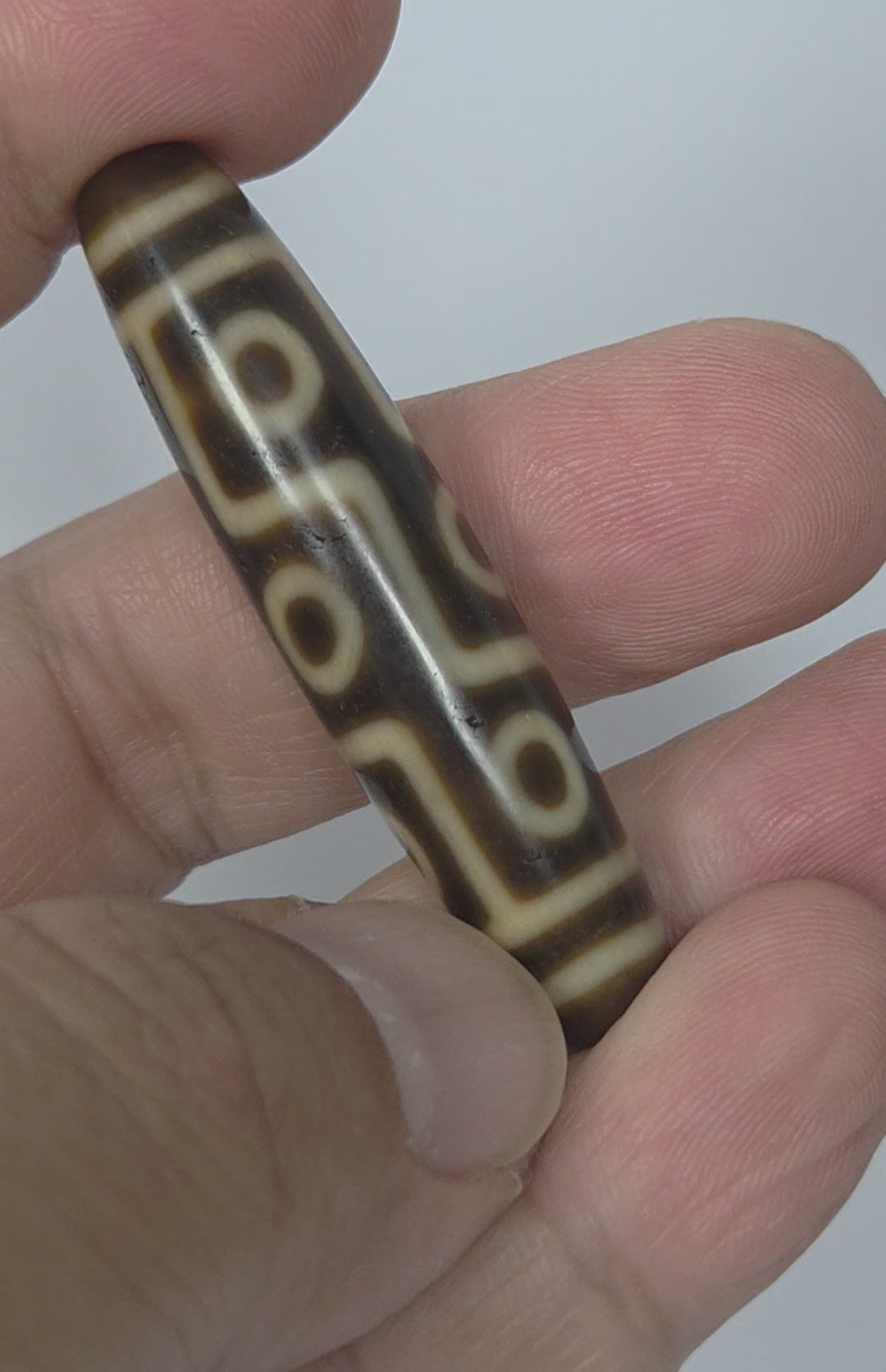 This antique Tibetan dzi bead measures 53.7 mm x 12.1 mm.  It is an antique bead, estimated to be between 200 to 400 years old.