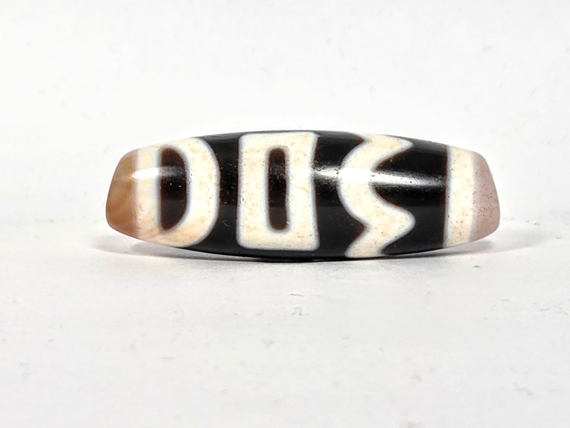 This antique Tibetan dzi bead is adorned with the Four Activities Motif (息增懷誅).  It is believed to help its wearer attain enlightenment.  The words息增懷誅mean pacifying, enriching, magnetizing, and subjugating.   The pacifying of conflict, sickness, and famine.  The enriching of longevity and merit.  The magnetizing of the three realms.  The subjugating of hostile forces.
