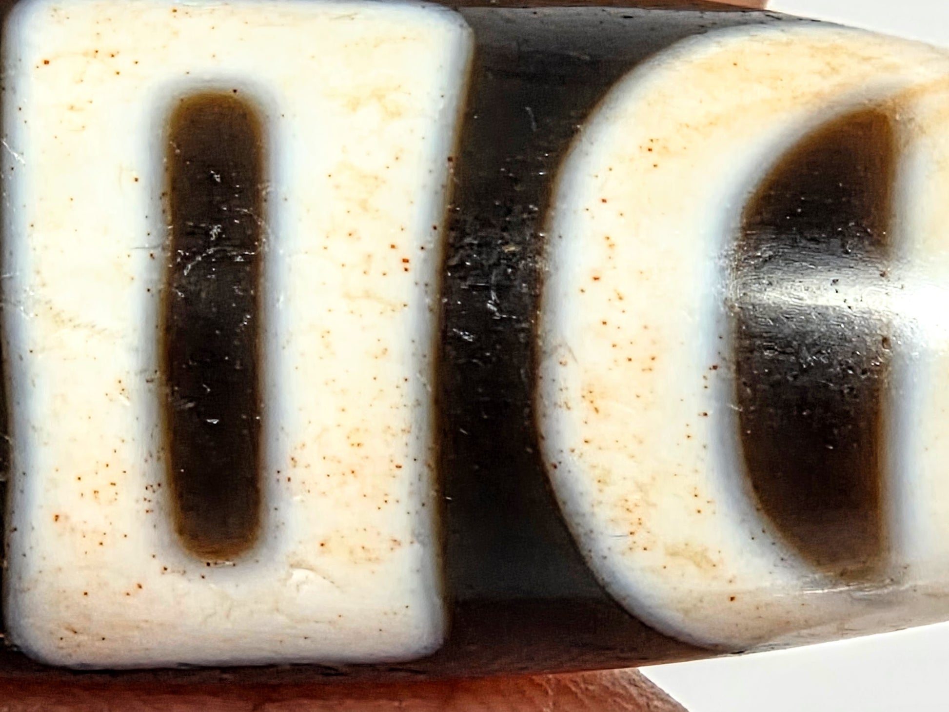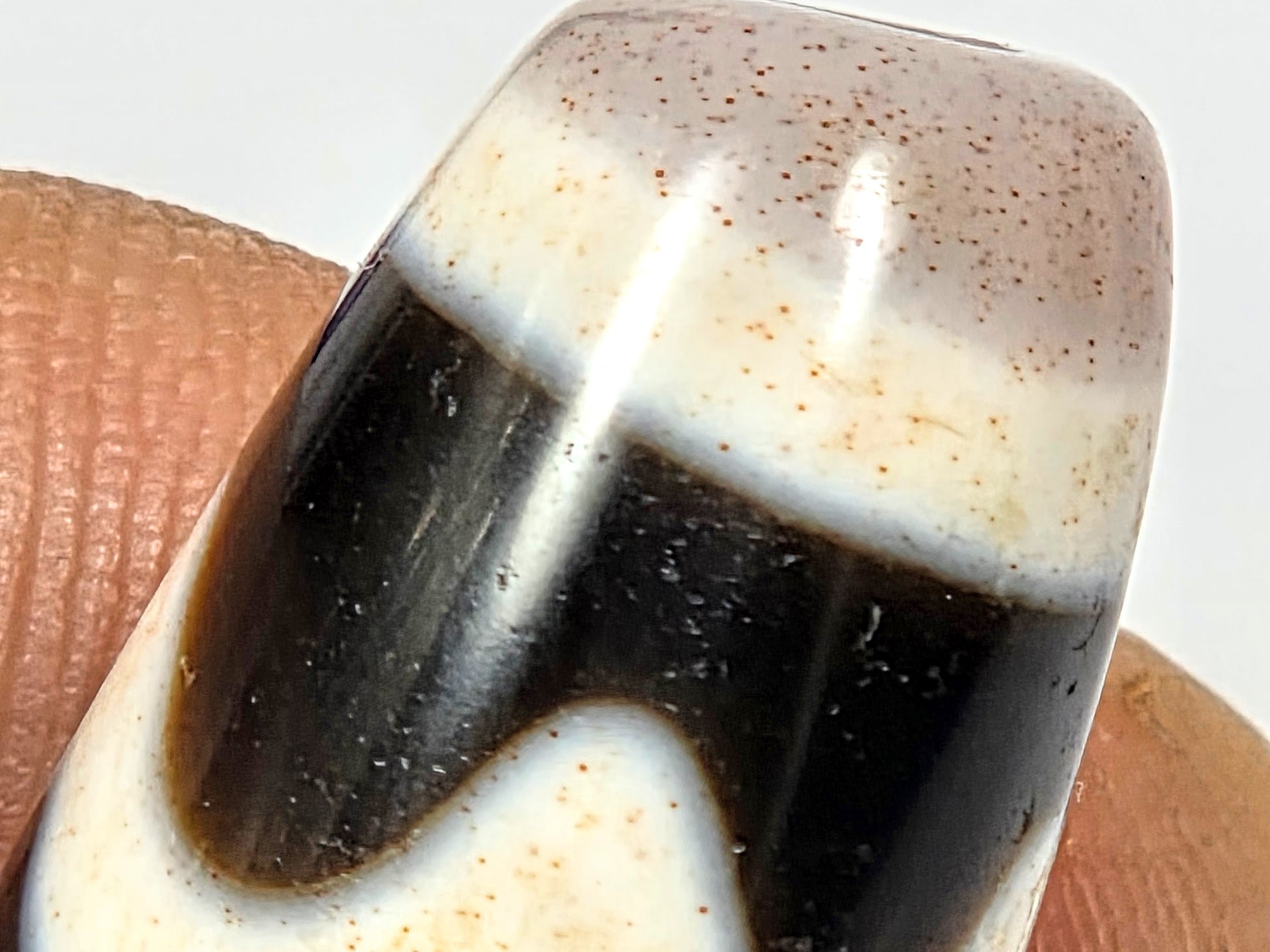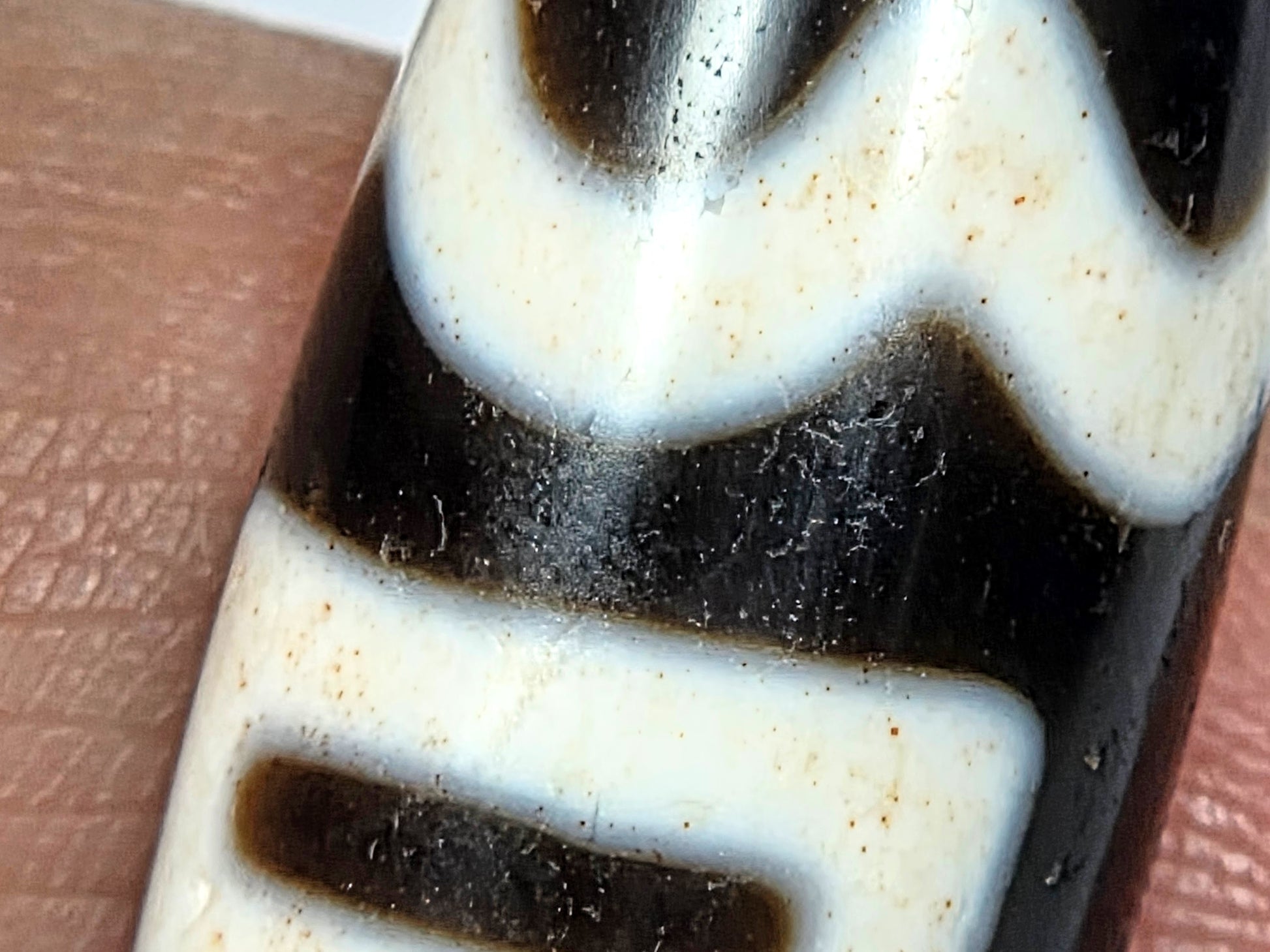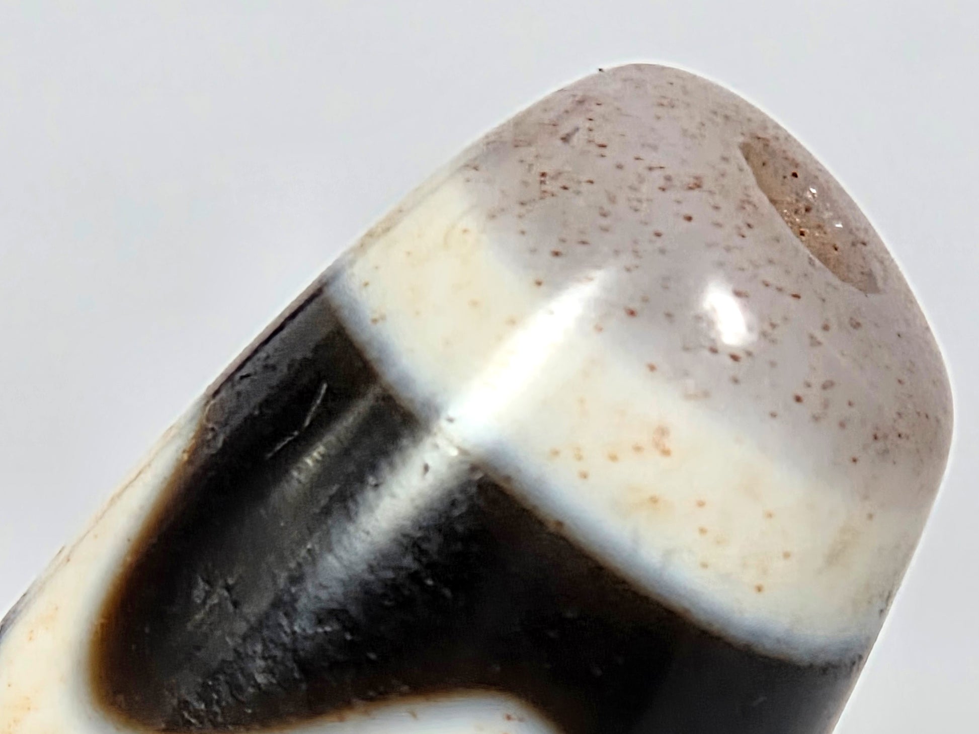 This bead is in excellent condition.  There are no cracks on this bead.  As with all antique dzi beads, weathering marks and minor digs are all part of the beauty.