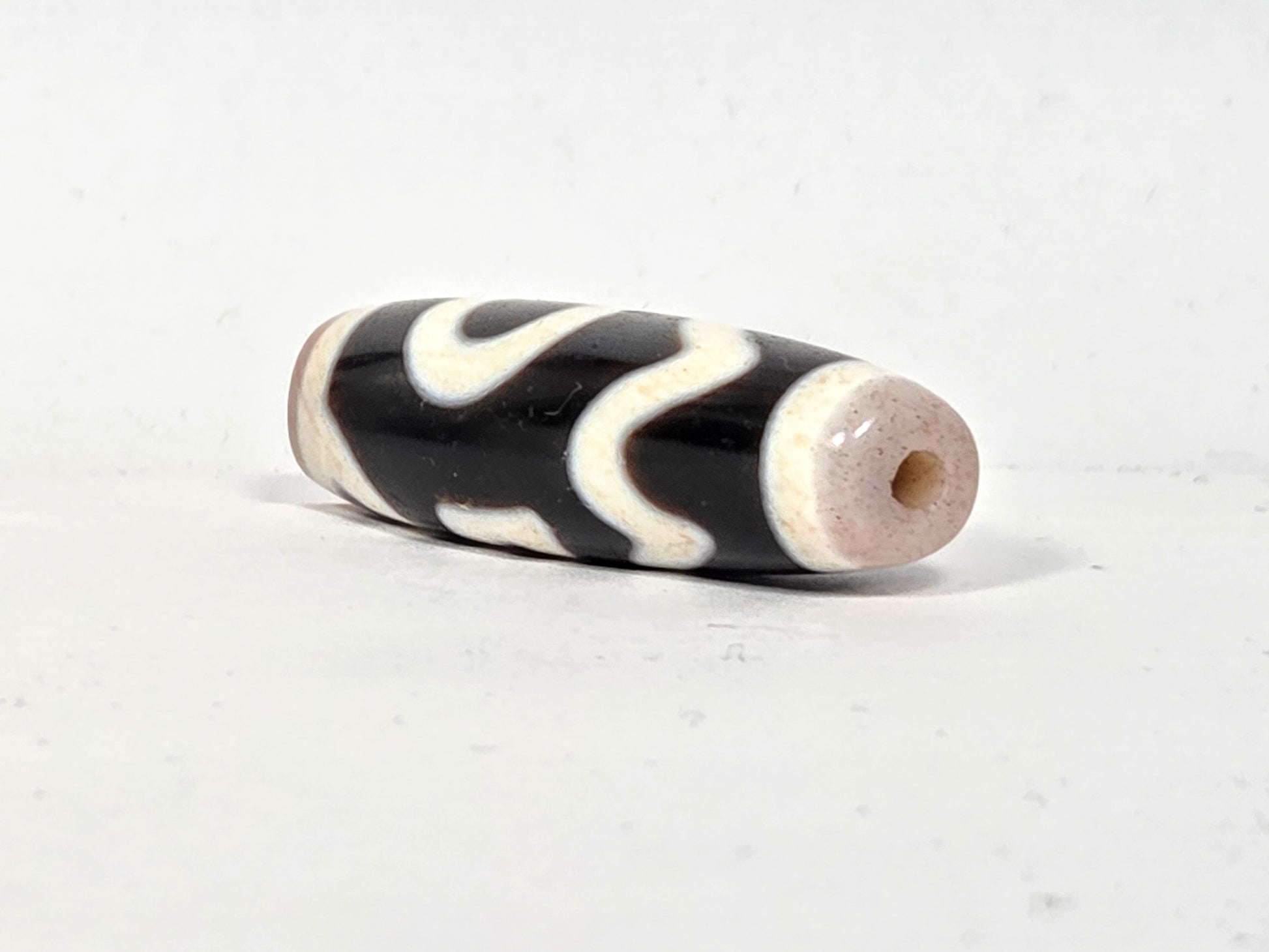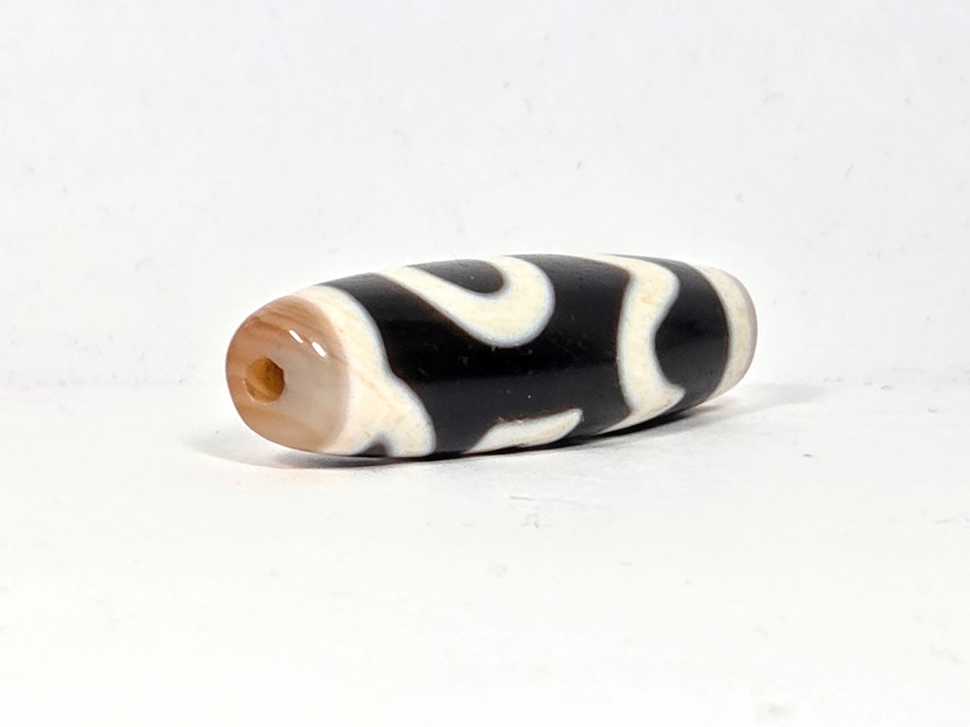 This antique Tibetan dzi bead measures 40.4 mm x 13.3 mm.  It is an old bead, estimated to be about 300 years old.